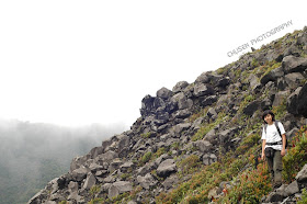 Sekitar pukul 12:30 kamipun melanjutkan perjalanan. Perjalanan semakin menantang, tanah tanah jadi becek, tanjakan juga semakin miring karena hampir mencapai puncak Sela. Dalam perjalanan masih sesekali duakali di sambut baik oleh makhluk tanpa tulang belakan pengisap darah yang ukuranya gak kalah besar dengan yang pertama ditemui. Selang 2 jam akhirnya kita pun mencapai puncak Sela. Di sekitar puncak tidak terlihat apa apa karena hanya diselimuti kabut dan awan. Karena sangat kelelahan setelah menanjak kita memutuskan istirahat sejenak sambil menikmati pencapaian puncak Sela.Istirahat ga terlalu lama, yang penting beberapa kalori pulih dan siap dibakar untuk menuruni bukit Sela menuju tempat camp deket tebing diatas kawah yang dinamakan pasir Pangrango. Eits… jangan buru buru turunnya, tingkat kemiringan ketika menuruni bukit Sela sekitar 80 derajat. Jarak pijakanya juga lumayan agak tinggi. Tak jarang harus turun dengan membalik badan atau duduk di tanah agar dapat turun pelan pelan. Kadang kadang ada pohon yang digunakan untuk berpegangan ketika menuruni tanjakan yang patah karena sudah lapuk. Setelah menuruni bukit yang curam, terdapat area yang cukup datar, dari situ kita seharusnya bisa melihat kawah. Namun karena kabut tebal, kami hanya melihat awan putih yang menyelimuti gunung. Sambil menunggu semua agar berkumpul kami beristirahat di lokasi bekas tempat camp. Disamping itu kita juga harus menyiapkan tenaga juga untuk melewati tanjakan lagi.