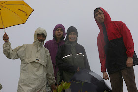 Akhirnya sampai puncak. Namun tidak berselang lama setelah ngobrol dan beristirahat. Tiba tiba kabut dingin menerpa dari bawah. Tak lama setelahnya Hujan cukup lebat, Kami segera membangun bivak dari flysheet agar barang bawaan kami tidak basah. Ada juga yang langsung mengenakan rain coat dan menutup backpack. Agar pulangnya tidak kemalaman setelah hujan cukup mereda kami langsung bergegas menuju Surya Kencana.Surya Kencana
