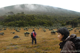 Selesai makan siang, dan setelah kemas kemas serta masih dalam keadaan gerimis kami melanjutkan perjalanan. Tak jauh dari situ sampai di Padang Edelweiss yang sangat luas. Dari sini kita dapat melihat puncak Gn Gede dari sisi baliknya Pasir Pangrango.