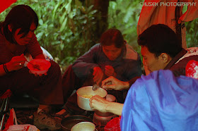 Tak lama menurunkan backpack dan menjulurkan kaki untuk istirahat, kami disambut dengan hujan yang cukup lebat. Petirpun ikut melengkapi dengan irama dan intonasi yang sangat serasi. Segera kami mendirikan bivak dari flysheet untuk melindungi barang bawaan kami. Beberapa dari kami menjaga api unggun agar tetap menyala dengan menutup atas api unggun dengan plastik yang cukup lebar serta membuat aliran air agar area bivak tidak di aliri air. Dengan ditemani hujan yang cukup lebat, kami menggelar matras dan membuka peralatan dapur. Kami mulai bahu membahu mempersiapkan makan siang. Satu setengah jam kemudian sekitar pukul 11:30 hindangan siap untuk disantap. Dengan ditemani hujan yang mulai berhenti kami menyantap hidangan yang cukup mewah dibanding dengan pendaki yang lain. Saya juga baru kali ini mendaki gunung dengan hidangan yang berbeda. Masak nasi, goreng dendeng, minum wedang jahe, tak ketinggalan menu wajib pendakian “mie instant” ditambah sarden. Biasanya orang ga mau susah, masak yang instant instant saja.Selesai menyantap makan siang, hujanpun reda. Bersih bersih alat dapur, repacking, dan siap melanjutkan perjalanan kembali. Belum lama selesai mempersiapkan perlengkapan, kami didatangi seekor lintah raksasa (mungkin) yang sedang berjalan disekitar bivak. Kalau diukur kira kira sekitar panjang 20-25cm diameter 1-1,5cm. Sangat besar untuk ukuran penghisap darah yang mungkin juga belum menghisap darah siapa siapa. Dengan ukuran yang cukup besar gerakanyapun cukup gesit. Namun sayang ga sempat ambil kamera untuk mengabadikan bentuk lintah tersebut.