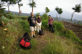(9 Mei 2009) Awal pendakian Awal perjalanan serasa berat banget padahal hanya jalan sedikit najak melewati areal perkebunan, mungkin karena baru bangun tidur. Namun lama kelamaan mulai terbiasa. Sesampai di areal perkebunan milik salah seorang porter, sambil menunggu teman yang masih dibawah, sang pemilik kebun memetik beberapa sayur brokoli untuk dijadikan santapan di camp.Setelah berkumpul, langsung melanjutkan perjalanan. Pagi yang cerah menyambut kedatangan kita. Sekitar pukul 06:15 kita mulai memasuki hutan. Suasana pagi yang cerah menjadi cukup gelap karena banyak pepohonan tinggi. Rute yang kita lewati bukan rute yang biasa dilewati para pendaki. Bahkan kala itu hanya kita yang melewati rute itu. Tak jarang kita harus membuka jalan dan menggerus tanah untuk pijakan kaki karena tanjakanya cukup curam. Sekitar pukul 07:20 kita beristirahat sejenak sambil menunggu yang masih dibelakang.